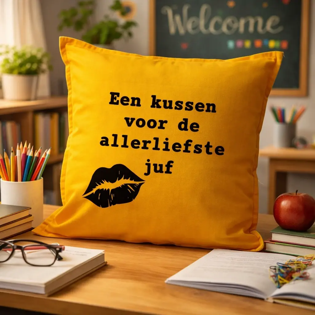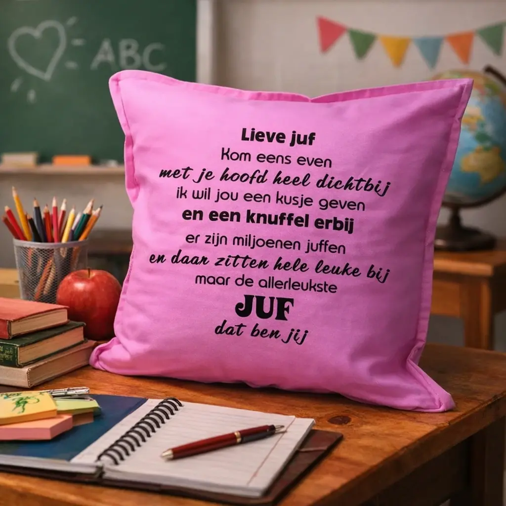 Wil je een persoonlijk cadeau juf geven dat niet standaard is? Dan is dit ontwerp een unieke keuze. Elk kussen wordt handgemaakt met oog voor detail. Daardoor voelt het cadeau extra speciaal. Het is een afscheid juf cadeau dat laat zien hoeveel waardering er is. Ook als juffencadeau voor de dag van de leraar is dit een prachtig gebaar.